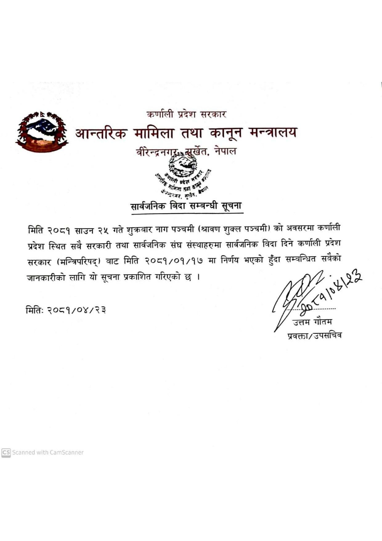 कर्णाली प्रदेश सरकारले नागपञ्चमीमा सार्वजनिक बिदा दिएको छ।