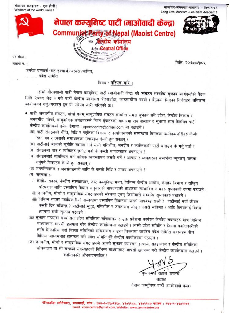 ७ दिनभित्र केन्द्रीय कार्यालयको इमेल ठेगानामा त्यस्तो सुझाव पठाउन उनले पार्टी नेतालाई परिपत्र गरेका हुन् । जेठ ५ मा प्रचण्डले पार्टी, जनवर्गीय संगठन, मोर्चा एवं सामुदायिक संगठन सम्बन्धि समग्र सुझाव सबै प्रदेश, केन्द्रीय निकाय र मोर्चा संगठनहरूलाई पठाउन भन्दै परिपत्र पठाएका हुन ।