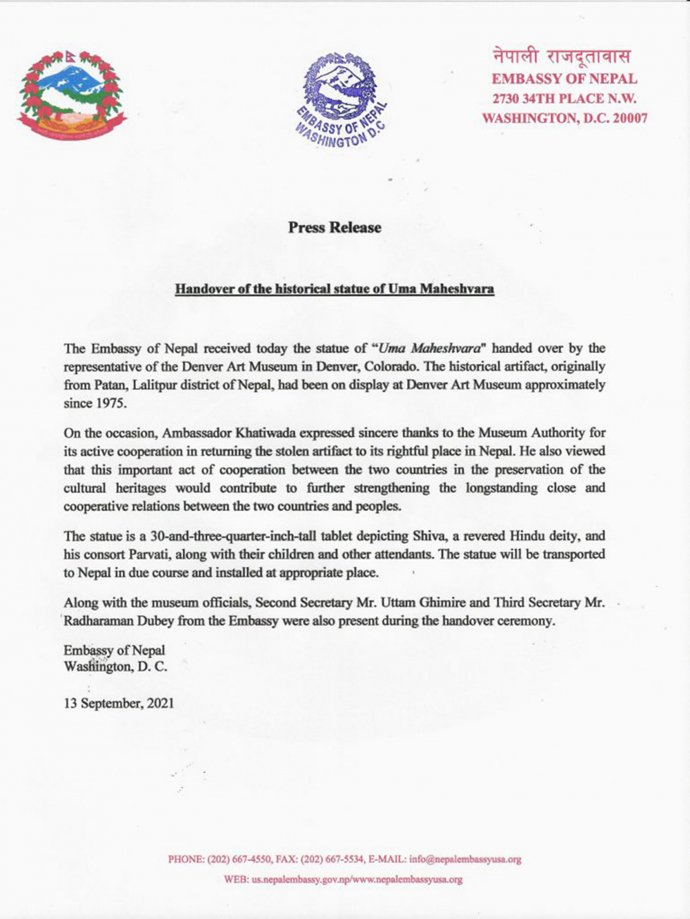 काठमाडौँ — पाटनको कुम्भेश्वर मन्दिर गा:हिटीमा रहेको र सन् १९६० को मध्यतिर हराएको उमामहेश्वरको मूर्ति अमेरिकाको कोलारोडो राज्यअन्तर्गत डेनभर म्युजियममा भेटिएपछि लामो अनुसन्धान प्रक्रिया टुंग्याएर वासिंटनस्थित नेपाली दूतावासलाई बुझाइएको छ ।