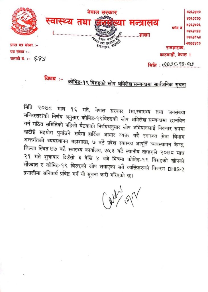 स्वास्थ्य तथा जनसंख्या मन्त्रालयले सोमबार एक सूचना जारी गर्दै आगामी शुक्रबारसम्म सो विवरण डीएचआईएस–२ प्रणालीमा अनिवार्य प्रविष्ट गर्न निर्देशन दिएको हो।