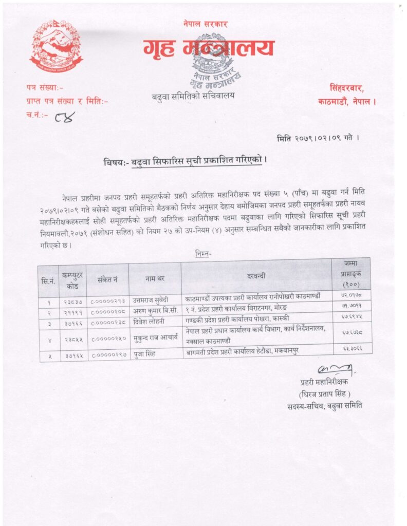 गृहमन्त्रालयको बढुवा समितिको बैठकले कार्यसम्पादन मूल्यांकन र ज्येष्ठताका आधारमा पाँचजनाको नाम सिफारिस गरेको हो।