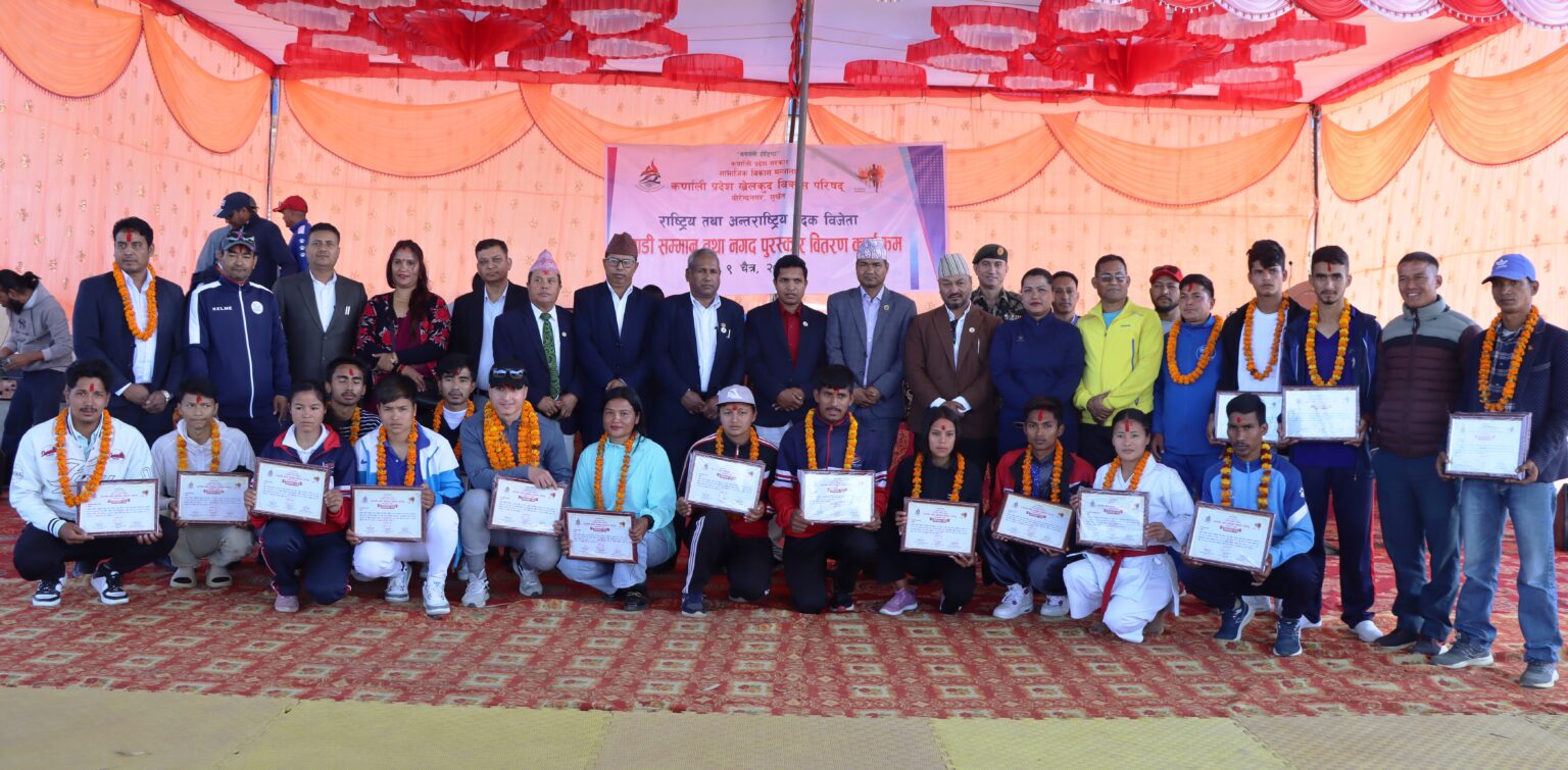 कर्णाली प्रदेशलाई विभिन्न पदक दिलाउने खेलाडी पुरस्कृत भएका छन्। कर्णाली प्रदेश खेलकुद विकास परिषद्ले राष्ट्रिय तथा अन्तर्राष्ट्रिय प्रतियोगितामा पदक जित्ने खेलाडीलाई नगद पुरस्कारसहित सम्मान गरेको हो। कर्णालीलाई विभिन्न प्रतियोगितामा स्वर्ण, रजत र कास्य पदक दिलाउने खेलाडीहरू सम्मानित भएका छन्।